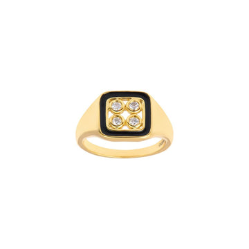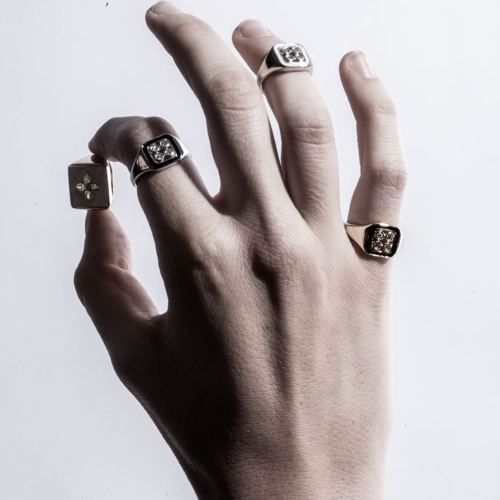 Marianne inaugure un tout nouveau dessin dans la collection Cabirol : un petit plateau carré évidé, serti de quatre "diamants écologiques" en serti clos, pour un style épuré et puissant.